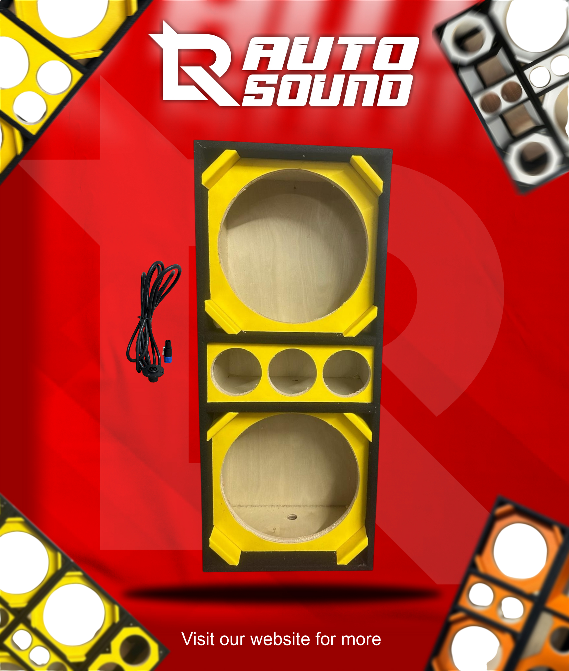Empty speaker housing for two 12-in woofers and two tweeters and one horn