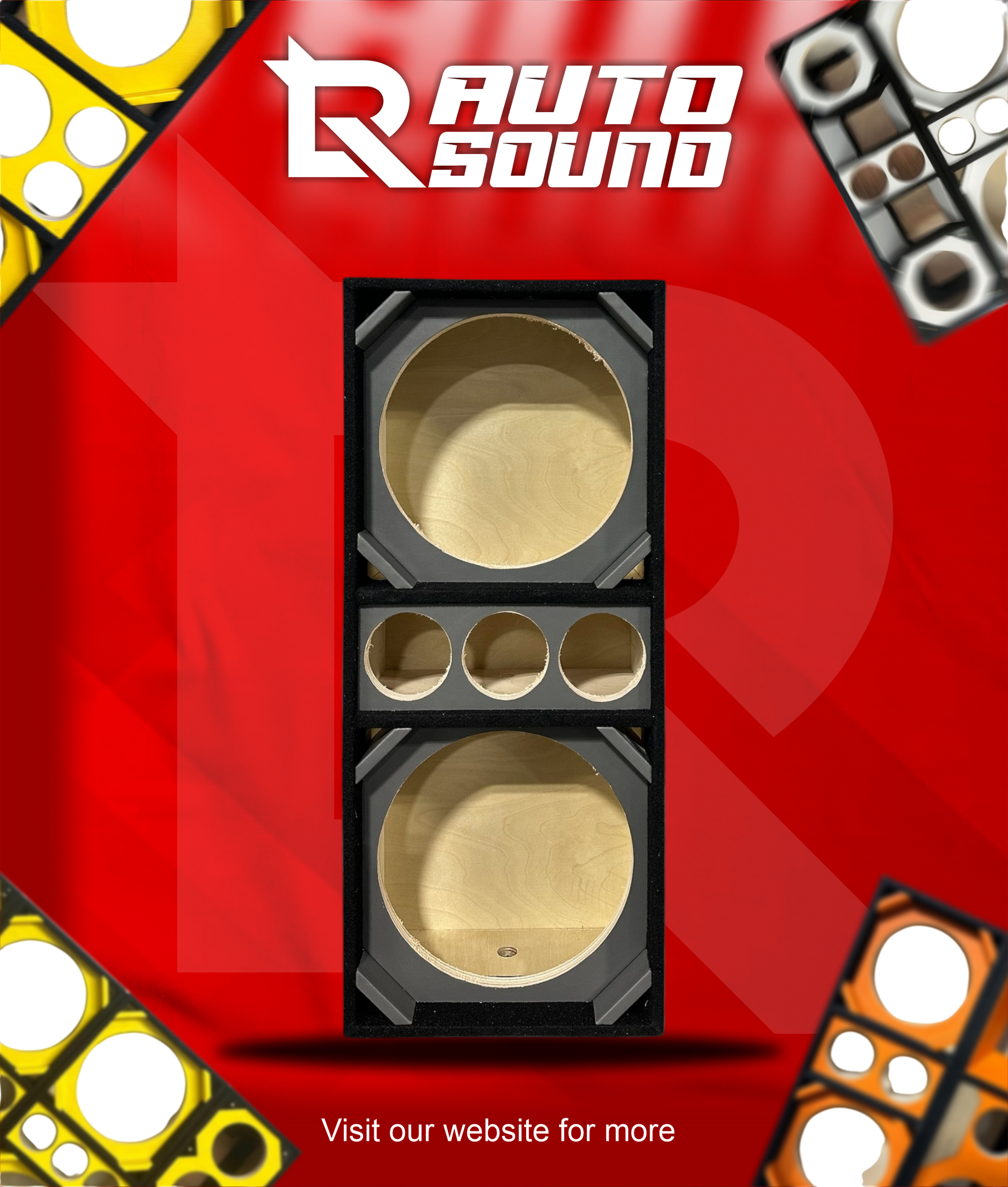 Empty speaker housing for two 12-in woofers and two tweeters and one horn